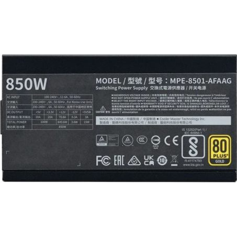 Cooler Master MWE Gold 850 V2 spełnia szereg norm i certyfikatów, w tym TUV, CE, CCC, EAC, RCM, cTUVus, FCC, BSMI, BIS oraz UKCA. To gwarancja wysokiej jakości wykonania oraz bezpieczeństwa użytkowania.